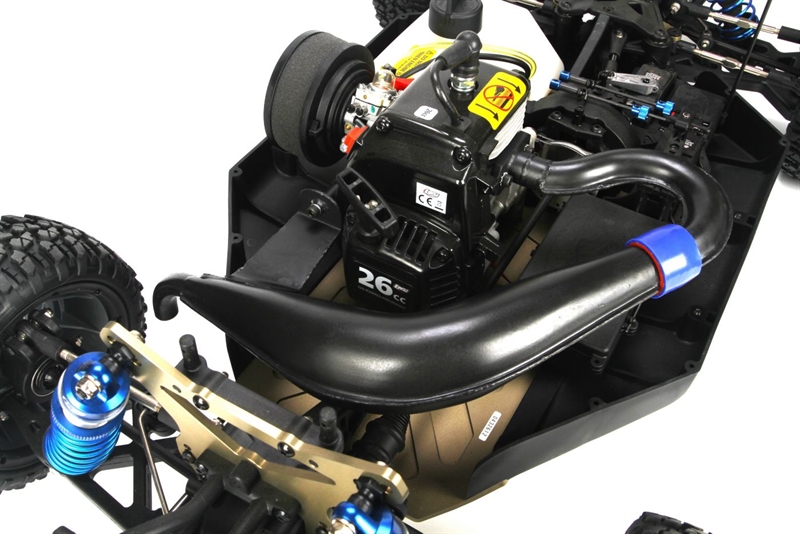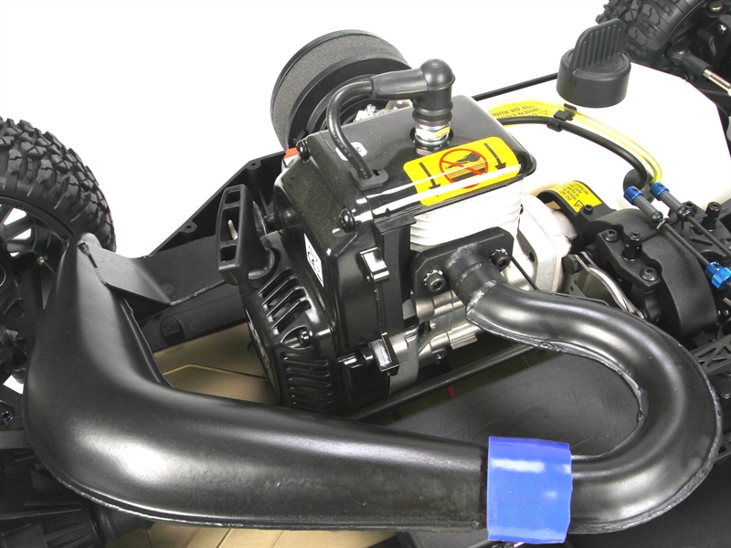 The Losi LOSR8020 tuned pipe is dollar-for-dollar the easiest and cheapest performance upgrade you can buy for your 5IVE-T. This complete exhaust system uses advanced two-stroke tuning technology to dramatically increase the low and mid range power and throttle response allowing any common 23-31cc engine to reach peak RPMs much quicker. The development was done over hundreds of laps and many hours by the Losi development team with the help of one the premier 1/5 scale engine/pipe builders. This design features a separate conical header and an ultra smooth tooled expansion chamber with a telescoping fit for both reliability as well as performance. The use of advanced precise tooling to produce both the header and the pipe optimizes the shock wave effect of the expansion chamber system as well as maximizing the durability. The hi-quality steel alloy is coated with a rust and heat resistant black finish for added protection and appearance. The compact design offers plenty of room for access to chassis parts and, since the pipe bolts directly and securely to the engine, gear changes and service on the clutch or engine is extremely easy. All mounting hardware, exhaust gasket and coupler are included as well as being available separately.