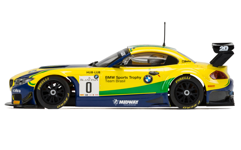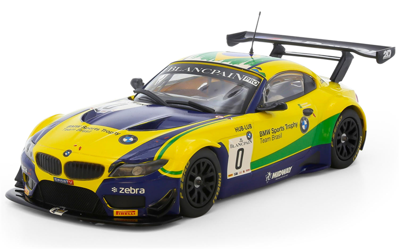 A legend of GT circuits all of the world, the iconic BMW Z4 is seen here wearing the colours of BMW Sports Trophy Team Brazil. Driven by Caca Bueno and Sergio Jimenez, the two Team cars finished in 2nd and 4th in the Brands Hatch leg of the 2015 Blancpain Series. A PCR underpan (sold separately) is available for this car, allowing you to install and run performance parts from Slot.it The BMW logo and the BMW wordmark are trademarks of BMW AG and are used under license.